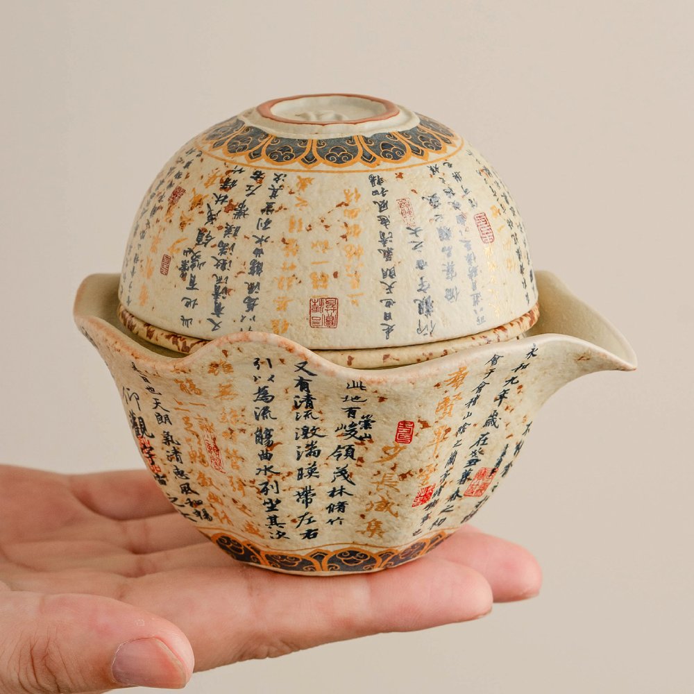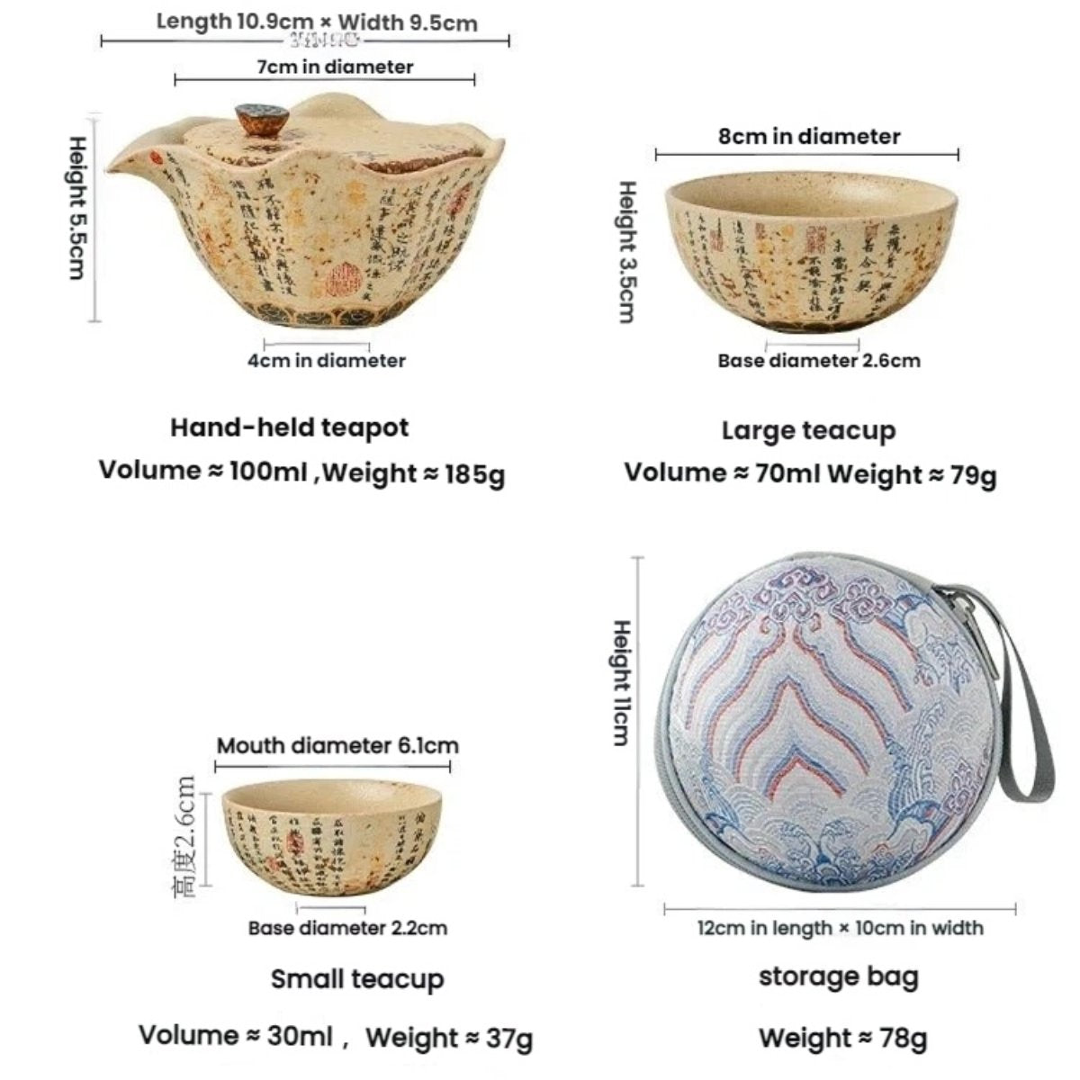 Designed with a stackable layout, the set allows for 60-second setup and 30-second storage, perfect for tea on the go. The intricate Lanting Xu calligraphy design and lotus leaf motifs capture the essence of Eastern artistry, making each tea session a moment of cultural immersion.