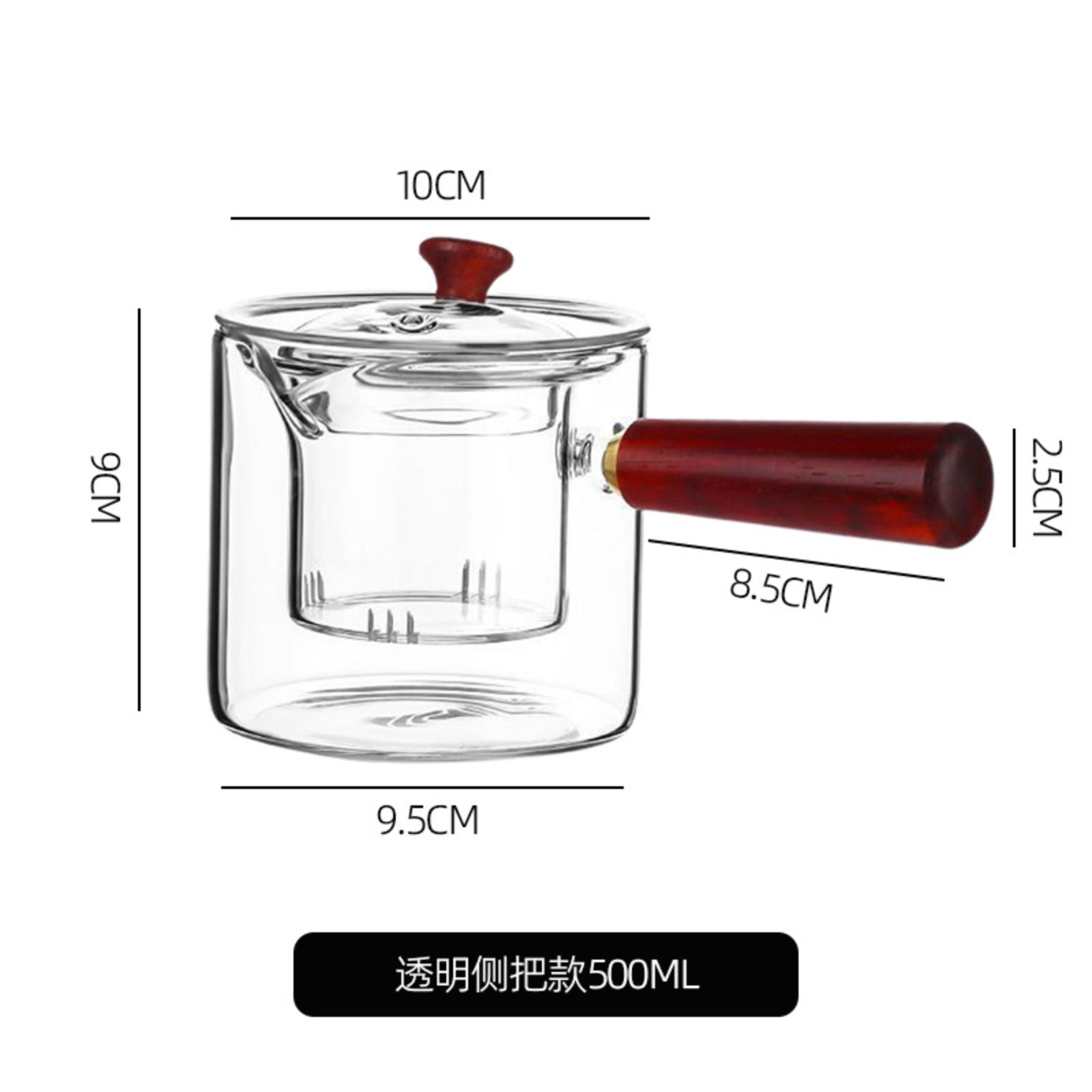 Enhance your tea experience with this 500ml heat-resistant glass kettle, available in clear and smoky gray variants. Made from durable borosilicate glass and featuring a natural wooden side handle, this kettle combines style, safety, and functionality for stovetop use.