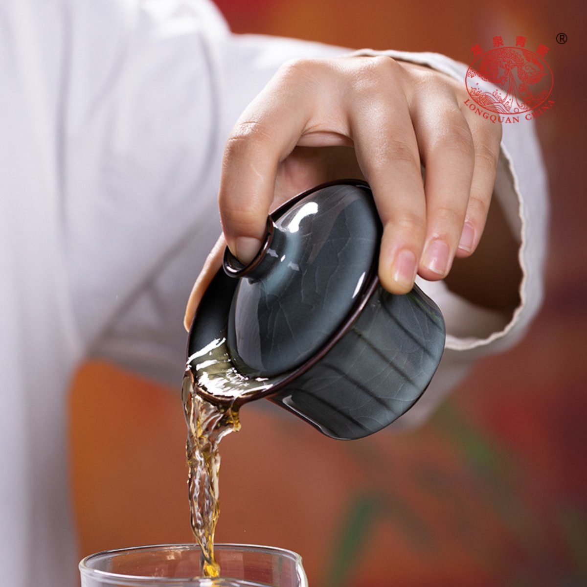 The Longquan celadon body is known for its smooth, delicate texture, lustrous glaze, and high durability. Its iron-infused porcelain base provides extra strength and a slightly darker tone, while the intricate crackle pattern adds visual depth and sophistication. The Gaiwan allows tea leaves to fully expand, releasing rich aroma and flavor, making it perfect for brewing Gong Fu tea.