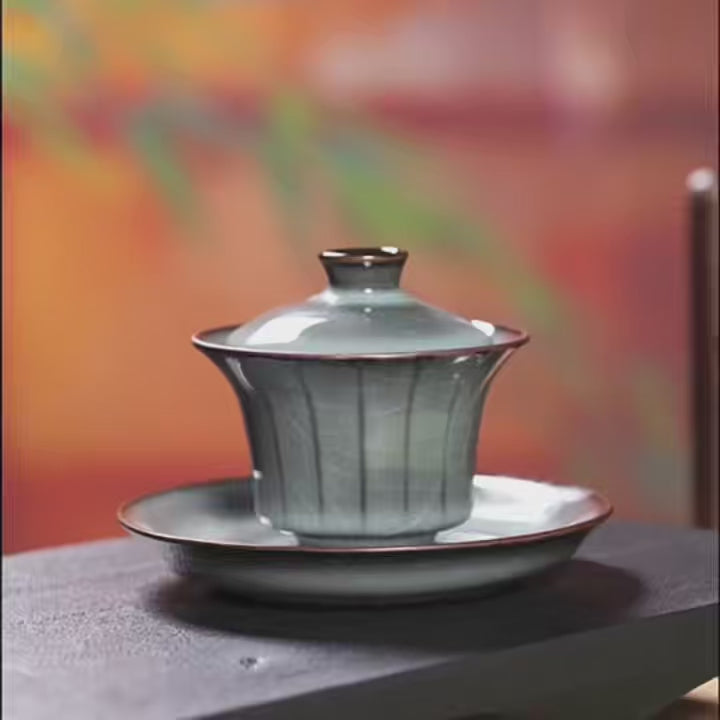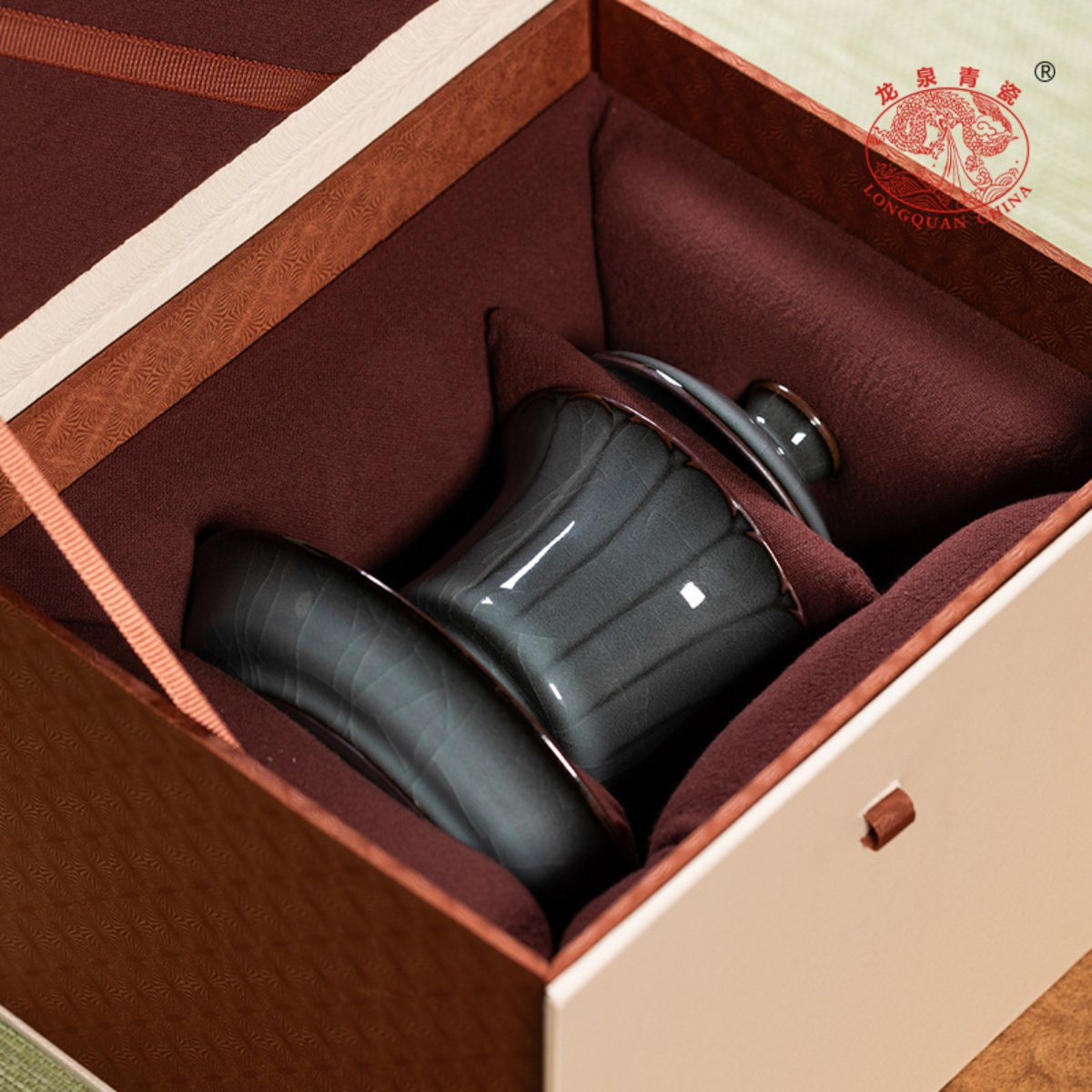 Longquan Celadon Gaiwan with Iron Body and Crackle Glaze, Begonia Shape, 130ML, Gift Box Set