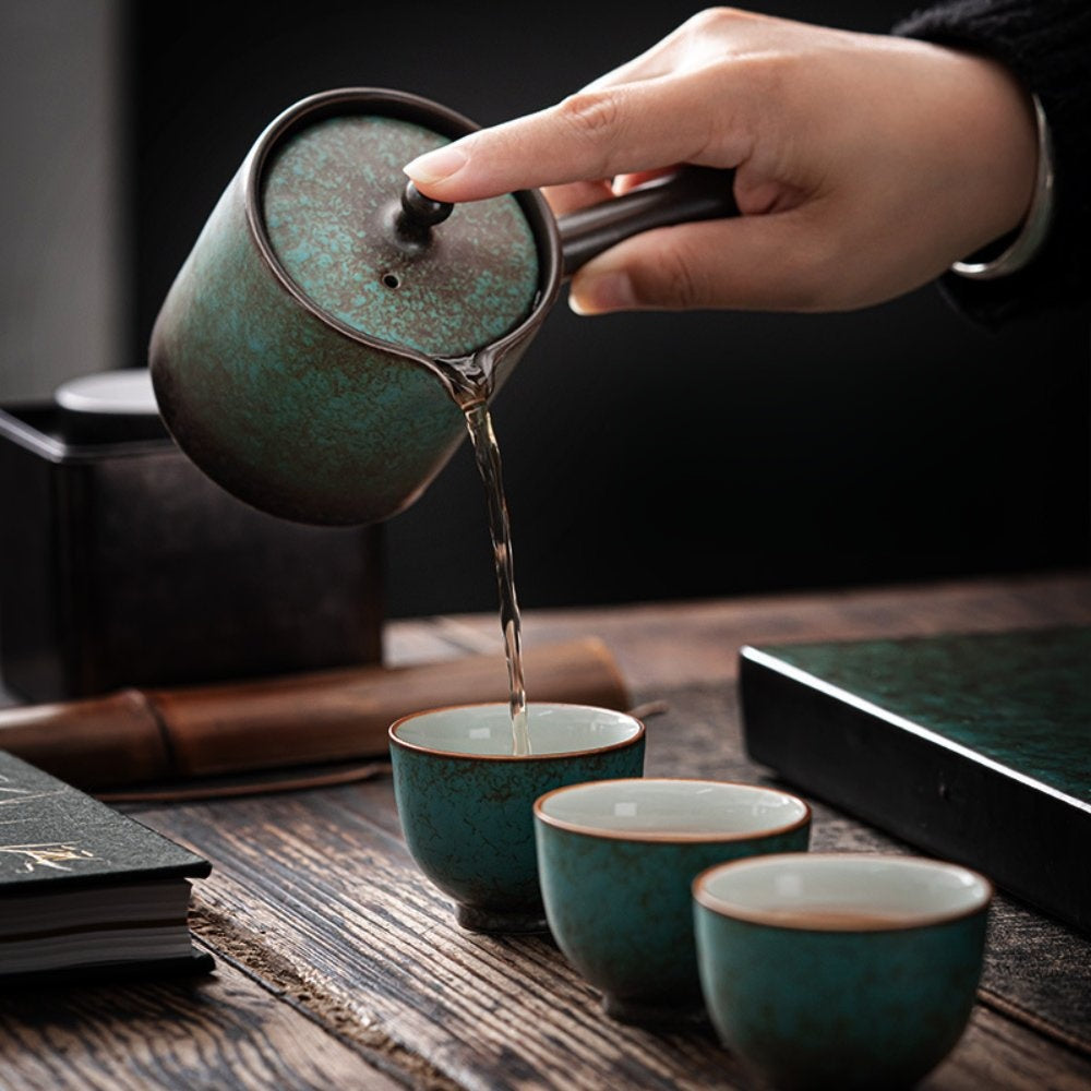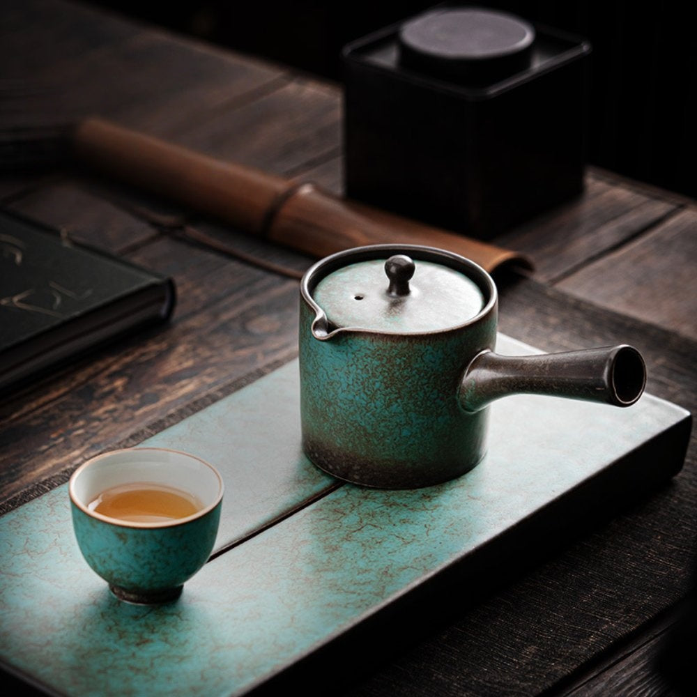 This Zhanlan blue glazed retro ceramic side-handle teapot is crafted from high-quality clay with a rich, earthy texture. The pottery exhibits natural kiln variation colors, giving each teapot a unique and classic aesthetic.